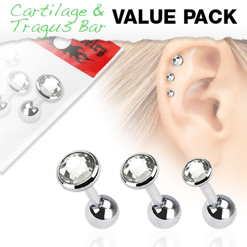 Набор их трех микроштанг из хирургической стали 316L со стразами диаметром 3, 4 и 5 мм