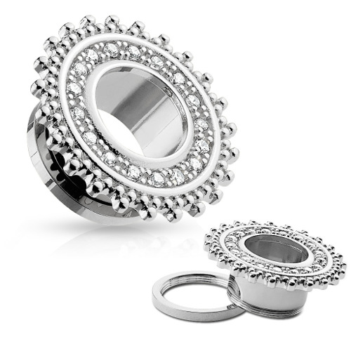 Тоннели из хирургической стали 316L с узорчатым оформлением из родированной латуни в комбинации со стразами.