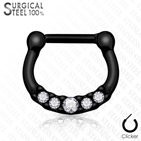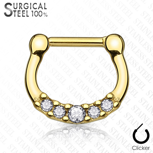 Аккуратный кликер из хирургической стали 316L с IP покрытием. Украшен пятью стразами.