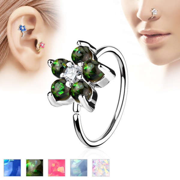 Раздвижное кольцо из хирургической стали 316L, украшенное латунным цветком из опаловой крошки под эпоксидной смолой со стразом по центру.