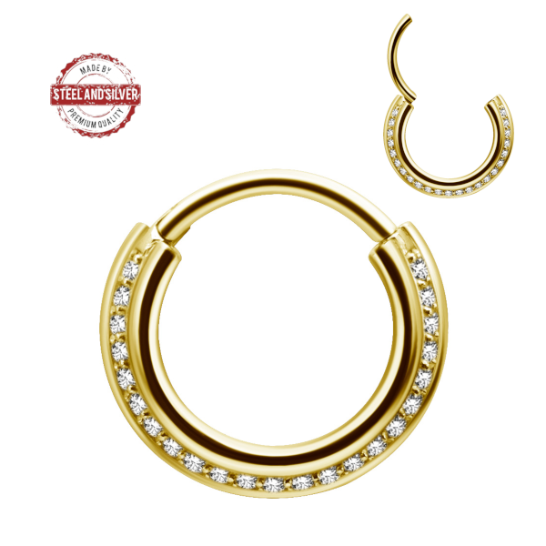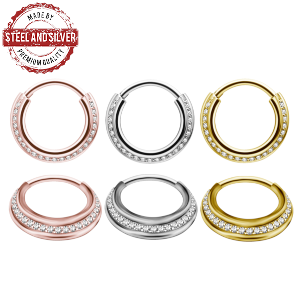 Кликер из хирургической стали 316L украшен фианитами. Представлены также вариации с  PVD покрытием розового и жёлтого золота.