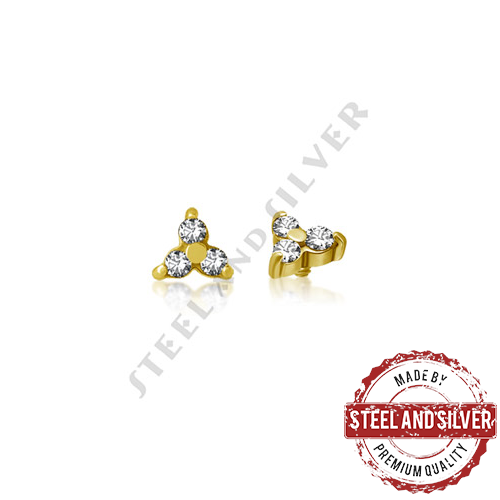 Накрутка из хирургической стали 316L с 24-х каратным золотым PVD покрытием в форме трилистника, украшенного кристаллами Premium Cubic Zirconia. Резьба накрутки 0,8 мм для украшений толщиной 1,2 мм. Диаметр накрутки 4мм.