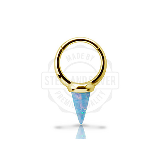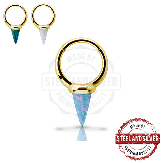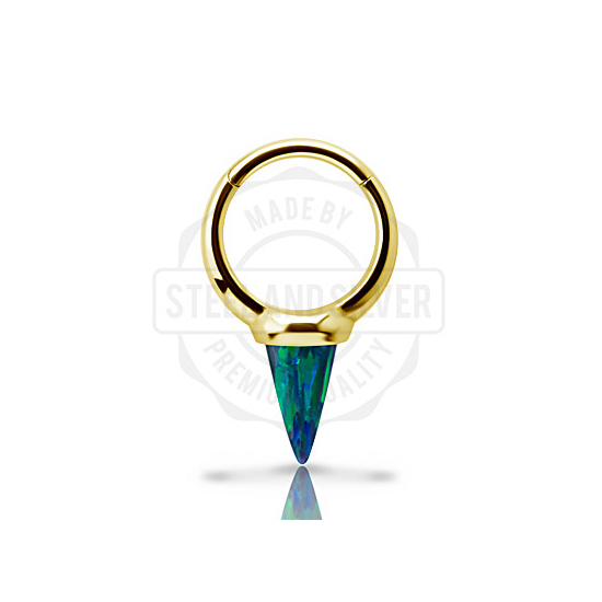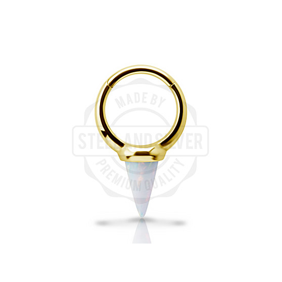 Кликер из хирургической стали 316L с золотым PVD-покрытием, украшенный конусом из синтетического опала размером 6х10мм.