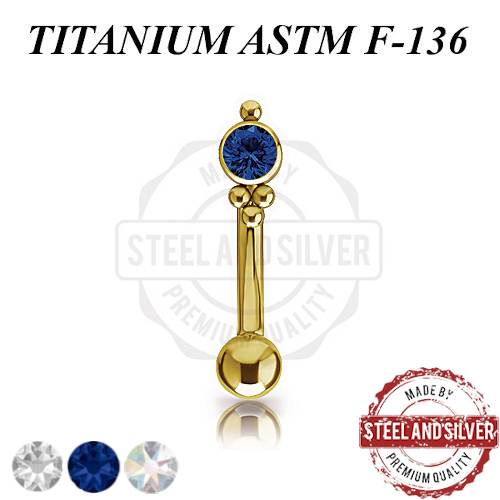 Микробанан с внутренней резьбой из имплантационного титана 6Al-4V-Eli ASTM: F-136 с PVD покрытием 24х каратного золота. Украшен кластером высотой 5.5мм c кристаллом Premium Zirconia.