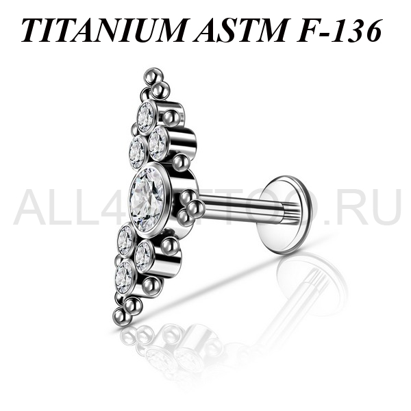 Лабрет из имплантационного титана 6Al-4V-Eli ASTM: F-136 с внутренней резьбой и кластером, украшенным прозрачными фианитами. Размер декоративной части: 13х7мм.