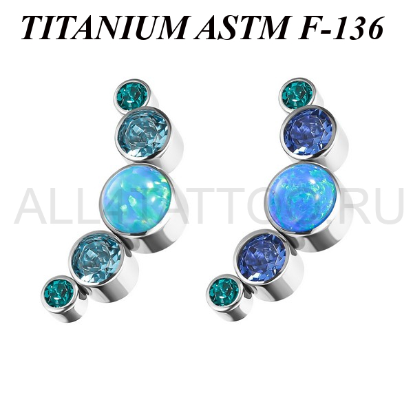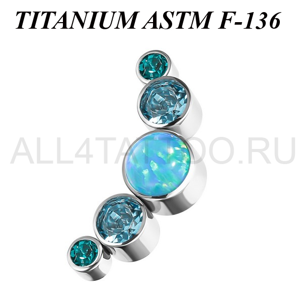 Кластер из имплантационного титана 6Al-4V-Eli ASTM: F-136. Украшен лабораторным опалом и цветными фианитами. Размер декоративной части: 13х5,3мм. Подходит для украшений с внутренней резьбой толщиной 1 и 1,2 мм.