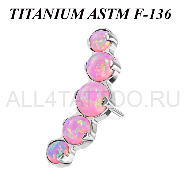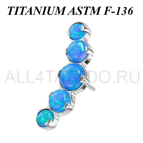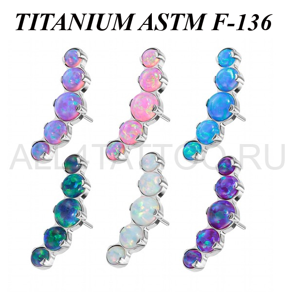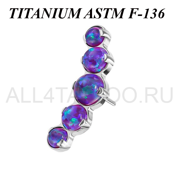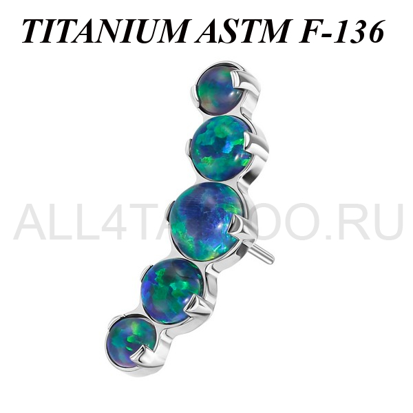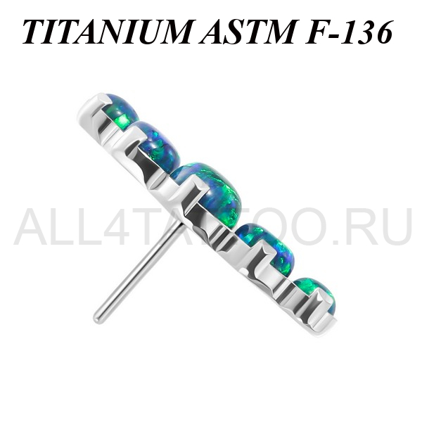 Вставка из имплантационного титана 6Al-4V-Eli ASTM: F-136 для безрезьбовых украшений. Украшена кластером с пятью опалами. Размер декоративной части: 4,5х12,5мм.