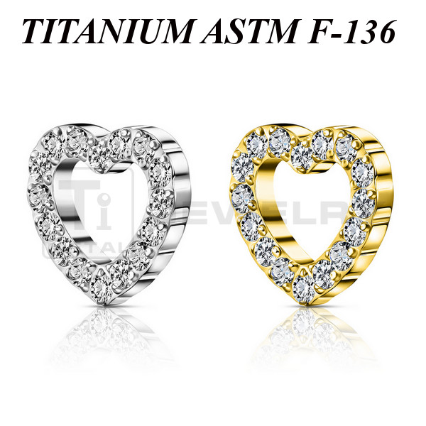 Накрутка из имплантационного титана 6Al-4V-Eli ASTM: F-136 в форме сердца, украшенного прозрачными фианитами. Представлена в двух вариантах: классическая титановая и с золотым PVD покрытием. Размер накрутки: 7х6,5мм. Подходит для украшений с внутренней резьбой толщиной 1 и 1,2 мм.