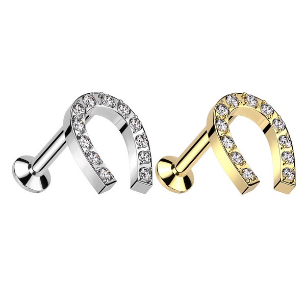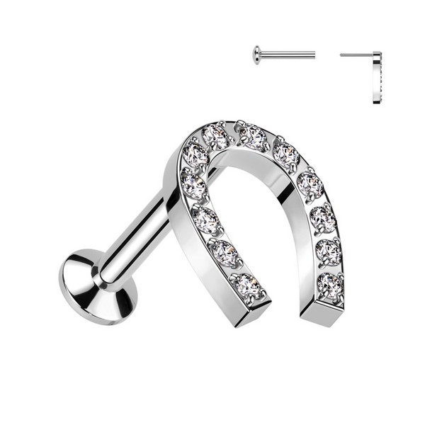 Безрезьбовой лабрет из хирургической стали 316L со вставкой из родированной латуни, украшенной прозрачными фианитами. Представлен в двух вариантах: классический стальной и с золотым PVD покрытием.