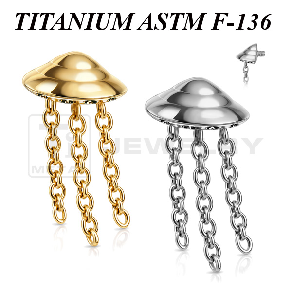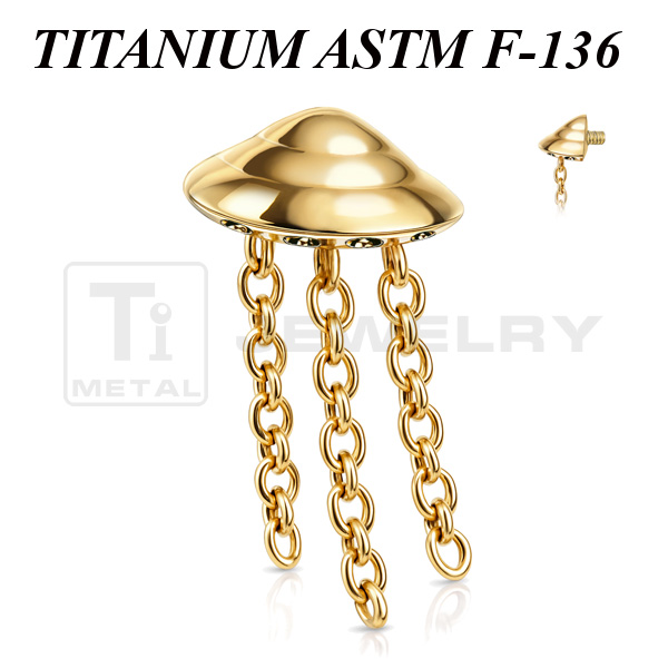 Накрутка из имплантационного титана 6Al-4V-Eli ASTM: F-136 в форме летающей тарелки с лучами. Размер основной части накрутки: 3,3х6,3мм. Длина цепочек 6,5мм и 8,2мм. Представлена в двух вариантах: классическая титановая и с золотым PVD покрытием. Подходит для украшений с внутренней резьбой толщиной 1 и 1,2 мм.