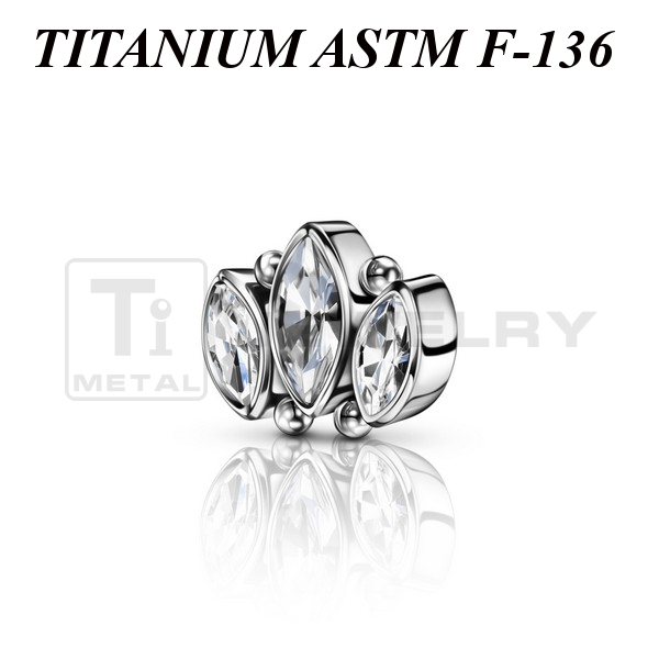 Накрутка из имплантационного титана 6Al-4V-Eli ASTM: F-136 с прозрачными фианитами огранки "маркиз". Размер накрутки: 6,3х5мм. Подходит для украшений с внутренней резьбой толщиной 1 и 1,2 мм.
