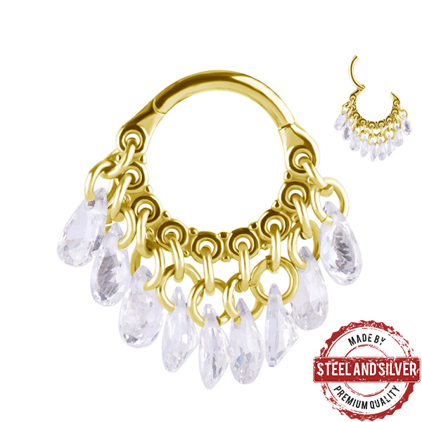 Кликер из хирургической стали 316L. Представлен в двух вариантах: классический стальной и с золотым 24х каратным PVD покрытием. Украшен кристаллами Cubic Zirconia