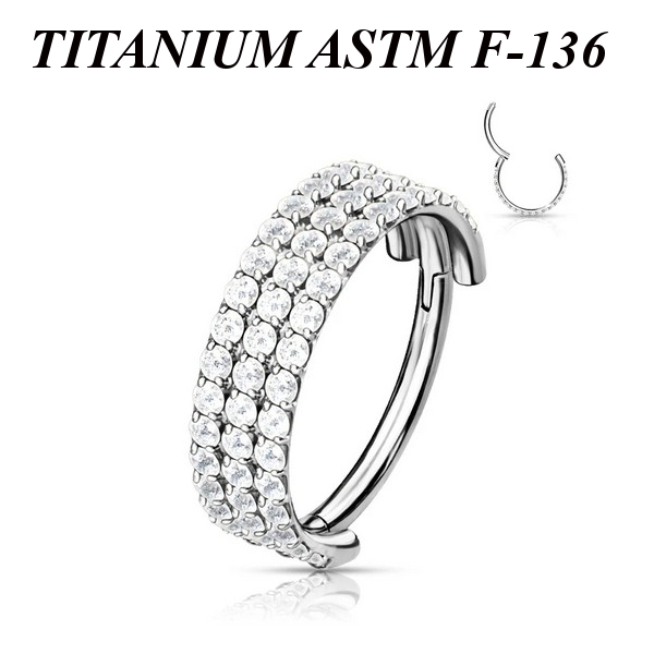 Кликер из имплантационного титана 6Al-4V-Eli ASTM: F-136 с тройным рядом миниатюрных прозрачных фианитов. Представлен в двух вариантах: классический титановый  и с золотым PVD покрытием.