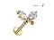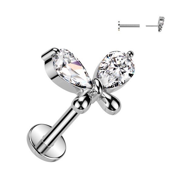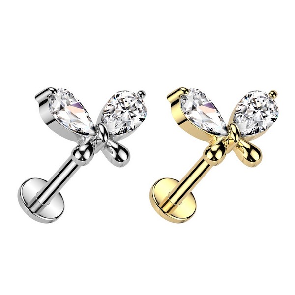 Безрезьбовой лабрет из хирургической стали 316L с декоративной частью из родированной латуни. Украшен фианитами. Представлен в двух вариантах: классический стальной и с золотым PVD покрытием. Размер декоративной части: 9,8х7мм.