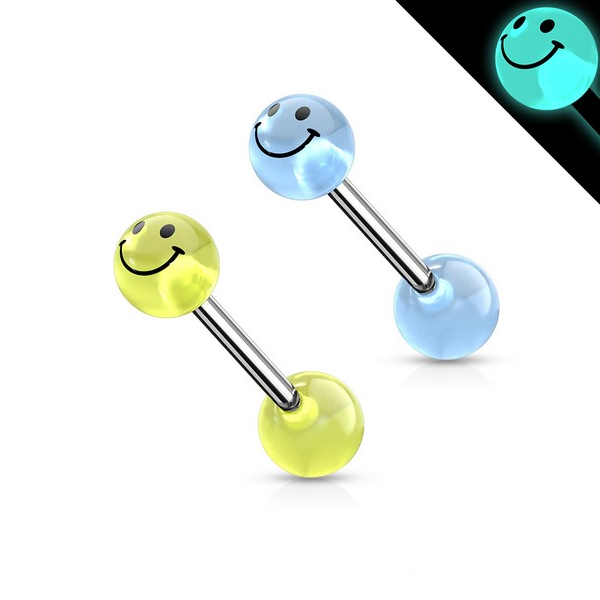 Штанга из хирургической стали 316L с акриловыми шариками светящимися в ультрафиолете.